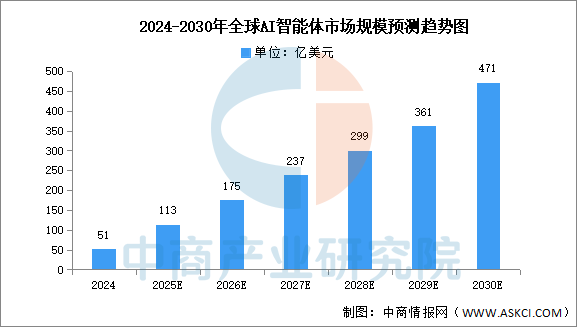 人工智能发展已进入关键转折期,智能体正以前所未有的速度从实验室走向产业核心。中商产业研究院报告显示,2024年全球智能体的市场规模约为51亿美元。目前全球智能体市场规模迎来爆发式增长,预计2030年全球智能体市场规模将接近500亿美元。
