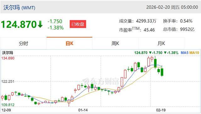2月19日,美股三大指数收盘全线万亿美元;沃尔玛最新收报124.87美元/股,跌1.38%,最新总市值9952亿美元。